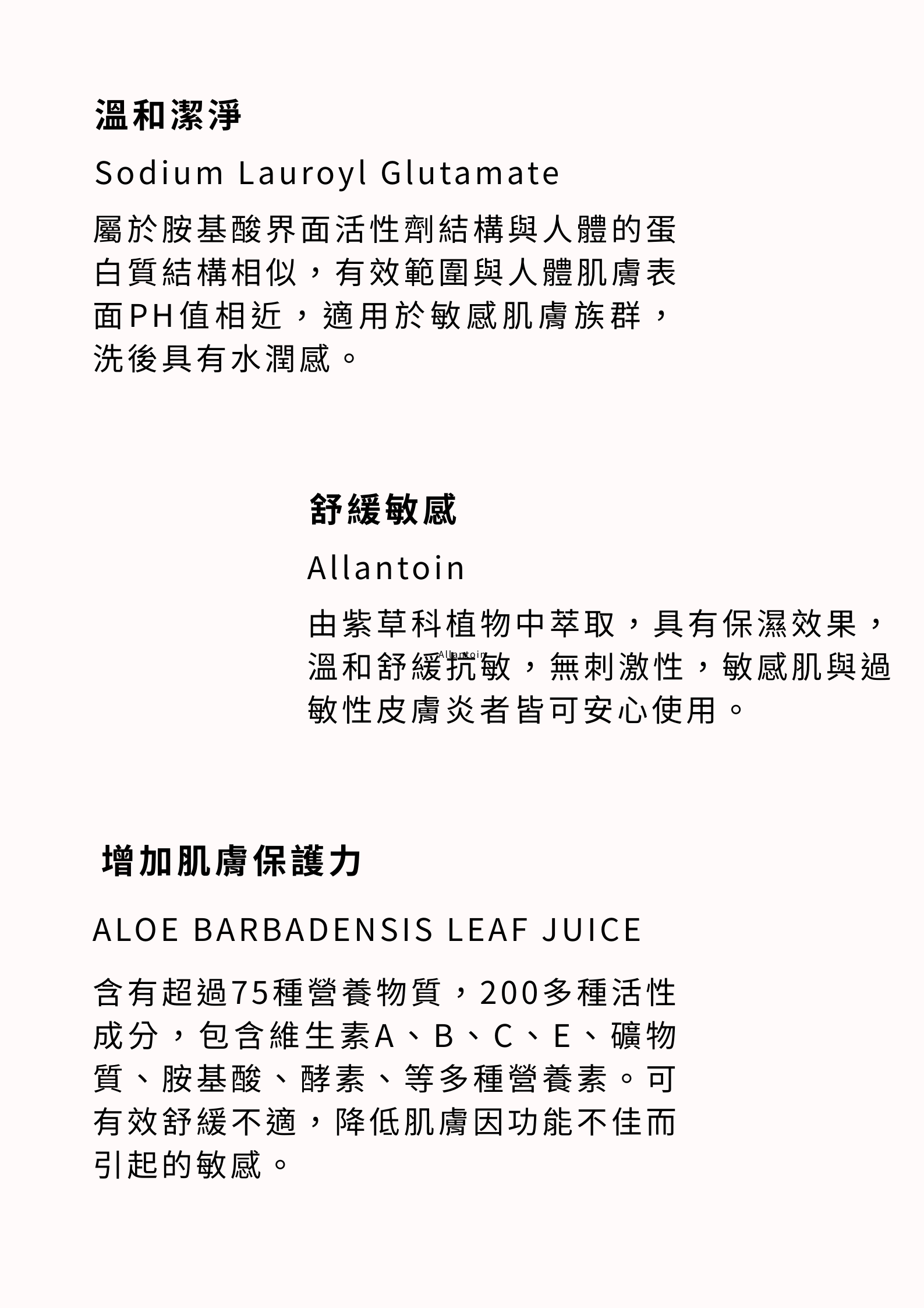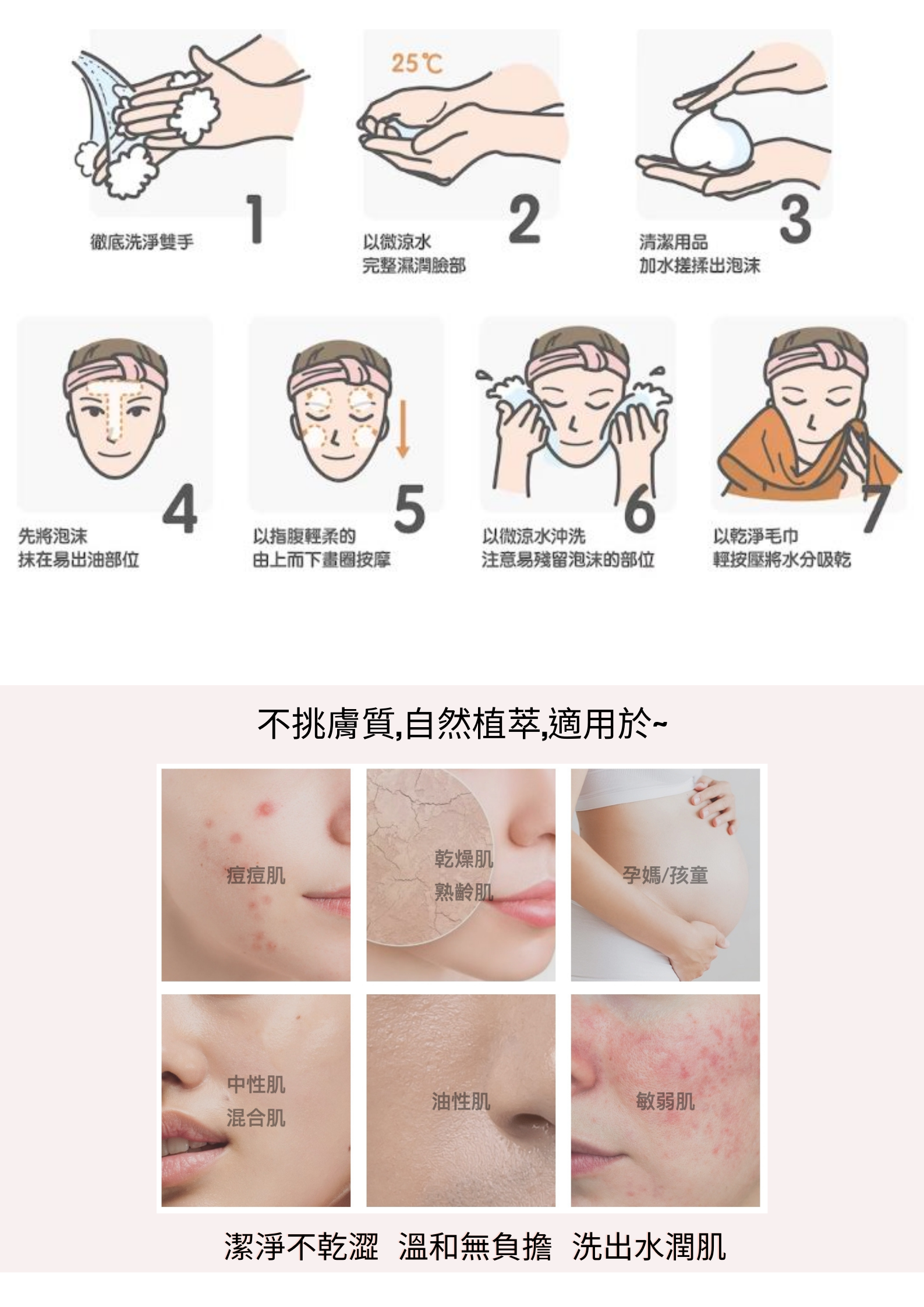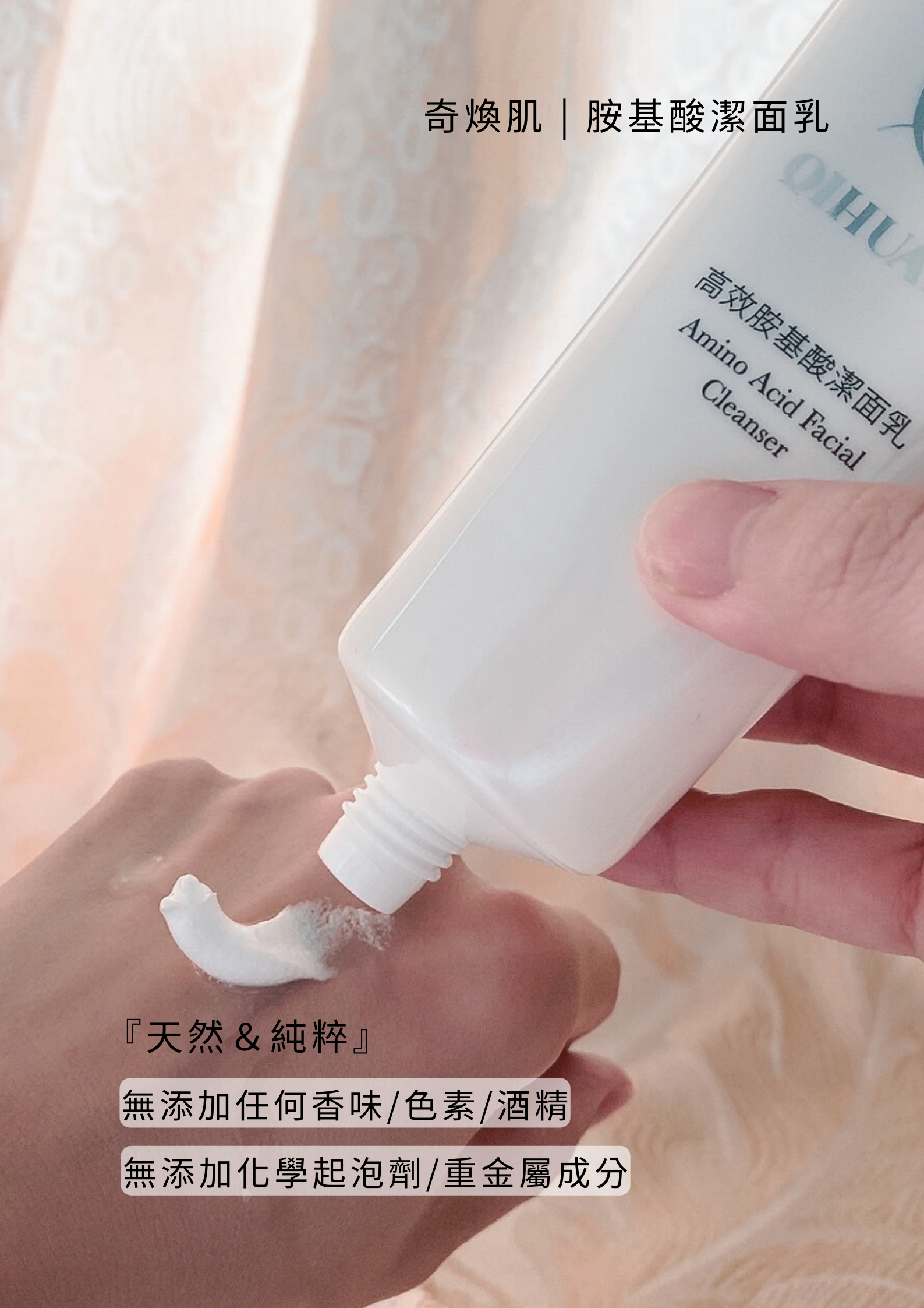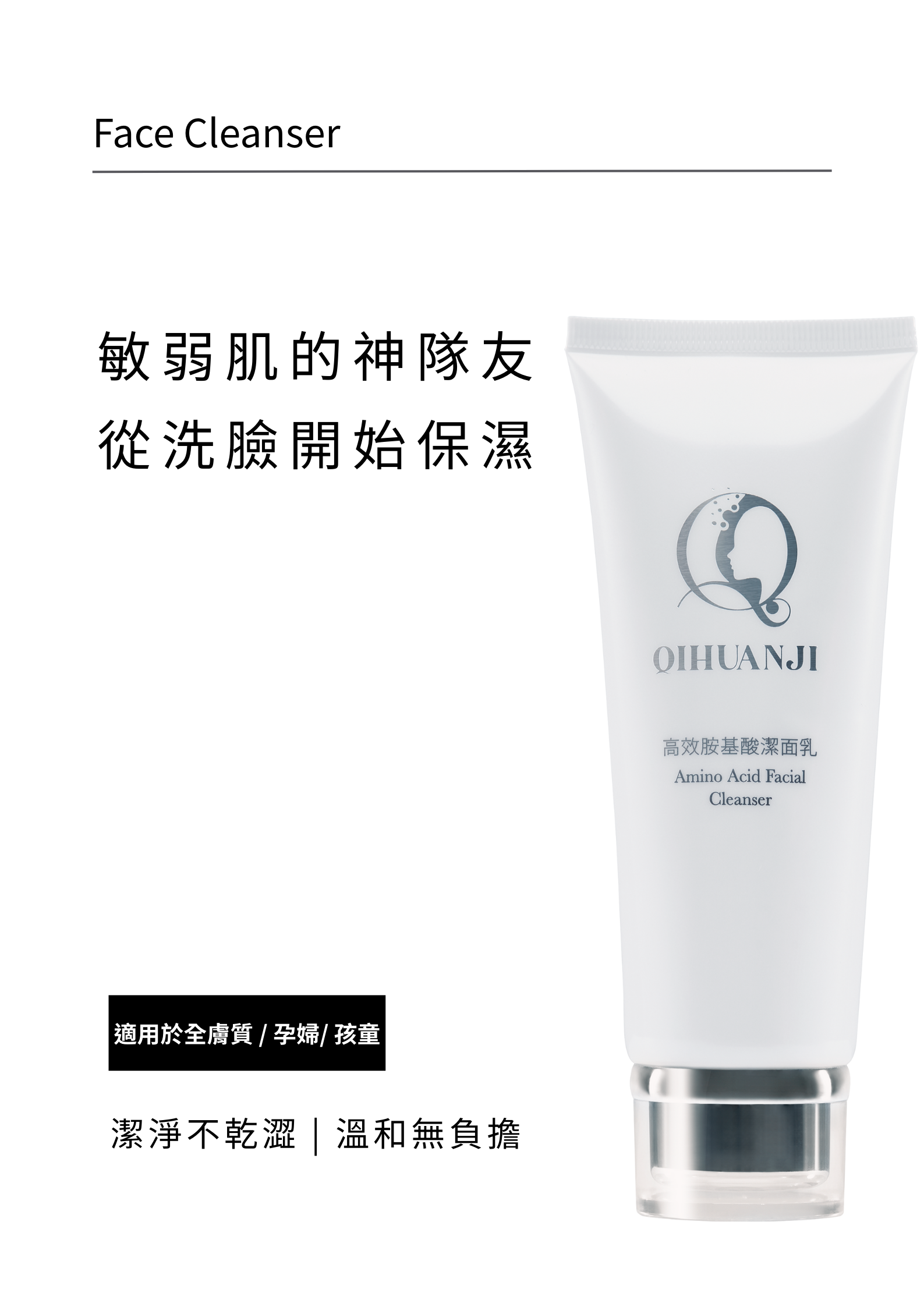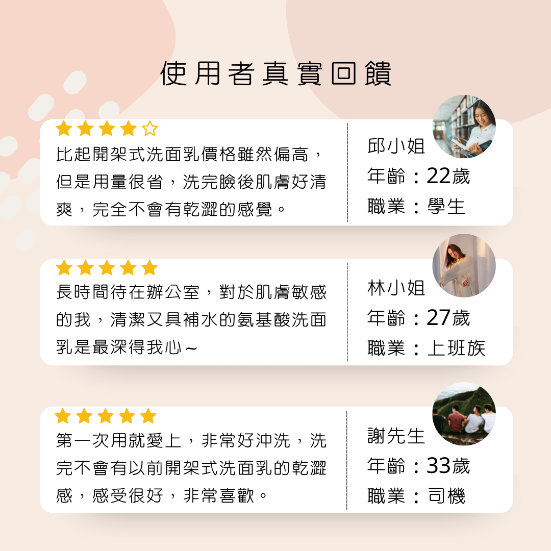 胺基酸溫和有效清潔,使肌膚清潔後水潤乾淨不乾澀。